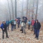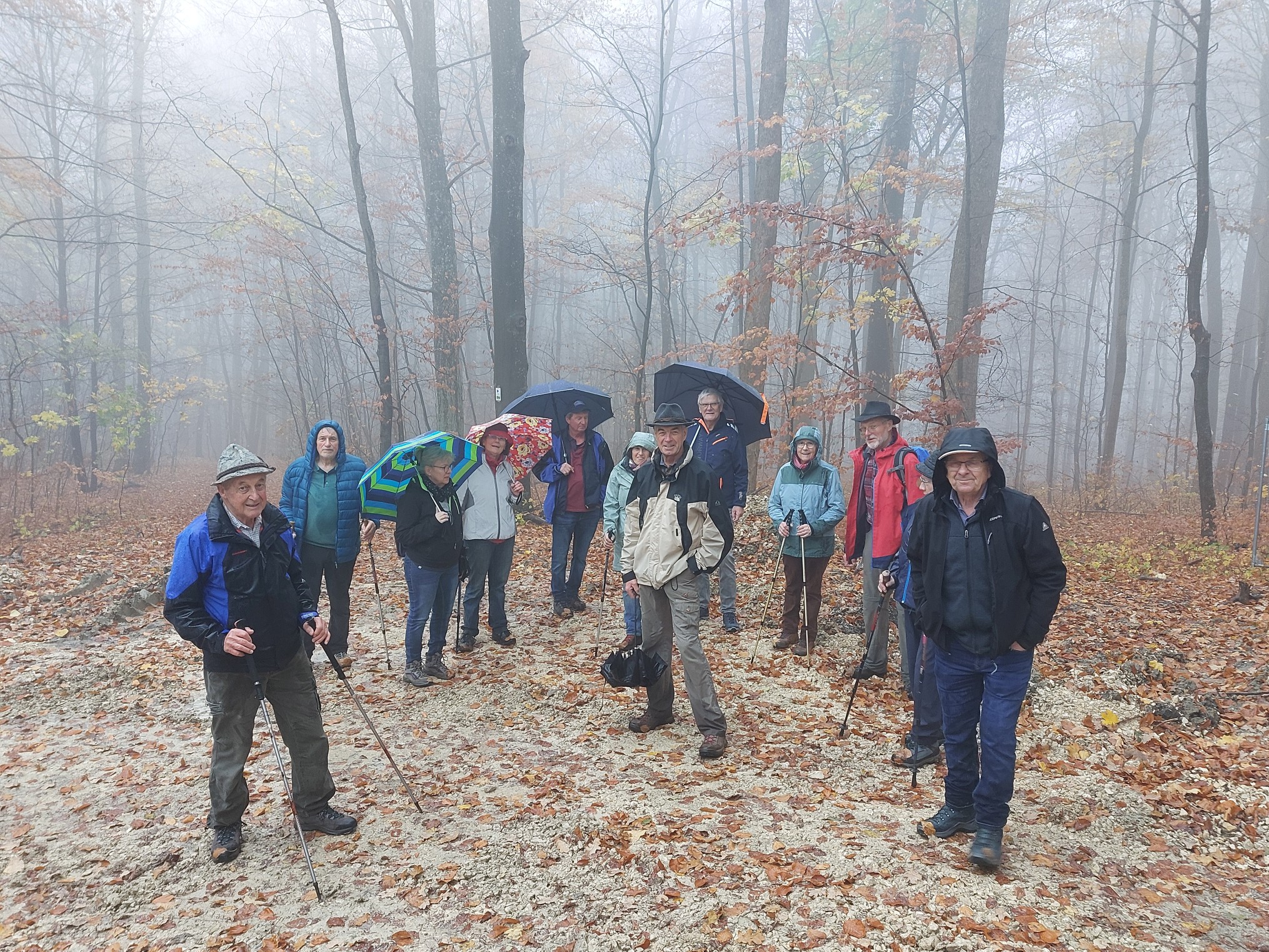 Am vergangenen Sonntag trafen sich bei wechselhaftem Wetter 13 Wanderfreunde beim Albvereinsheim zur letzten Sonntagswanderung in diesem Jahr. Die Wanderung nicht zu machen war keine Option, nach dem Motto „Es gibt kein schlechtes Wetter nur schlechte Kleidung“. Deshalb zog die Gruppe über die „Berliner Bruck“ los in Richtung „Hauwiesa“(Hohwiesen). Dort ging es dann an den Birnen Züchtungen von Jörg Geiger vorbei, um in den Weg zum „Wäschblau“ (Wespenlauch) einzubiegen. Da konnte man Bäume verschiedensten Alters und Wuchsformen sehen. Leider gestaltete sich auch das Wetter mit entsprechenden Schauern immer wieder sehr unterschiedlich. Auf der „Schwanzgass“ ( Schwanengasse) öffnete sich dann ein Ausblick auf Schlat und später auf Fuchseck- und Wasserberg. Viele waren dann überrascht am Waldrand im „Weingart“ die Rentnerbank von Eberhard Stein vor zu finden. Im Wald waren die Wege mit einer geschlossenen Laubschicht überzogen, so dass die Gruppe auf Wald- und Wanderwegen erst den Wasserhochbehälter und kurz darauf den Fuchseck Hof erreichte. Über dessen Zufahrtsweg ging es weiter in Richtung Gairensteige. Die Meisten hofften nun, das grüne Trauzimmer begutachten zu können. Leider war die Möblierung schon im Winterquartier, so dass nur der vorgesehene aussichtsreiche Platz oberhalb des „Gfells“ erkennbar war. Wegen der immer wieder einsetzten Regenschauern wurde nun der kürzere Weg über den Pfingstwasen und n